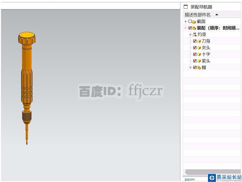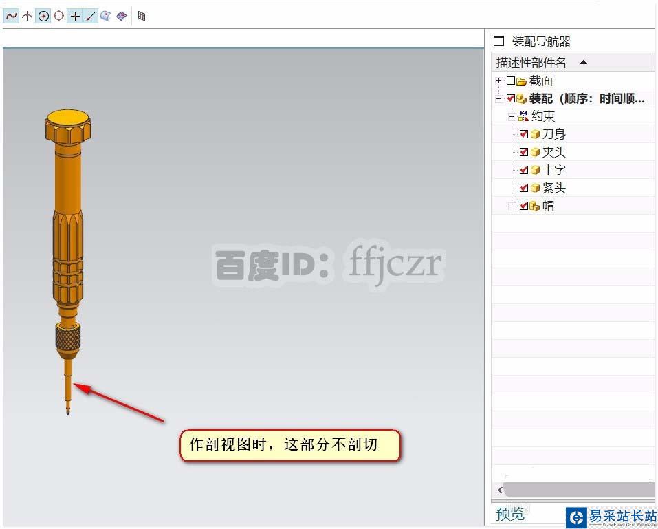 1、這里用一個(gè)簡單的裝配件來作說明。該裝配件為組合式螺絲刀,當(dāng)對(duì)裝配件進(jìn)行剖切時(shí),刀頭部分是不用剖切出來的。