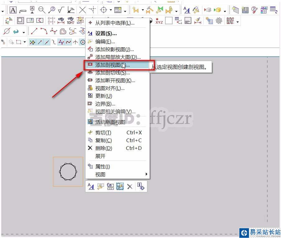 3、在生成的俯視圖圖框處點(diǎn)右鍵,在彈出的對(duì)話框中選擇“添加剖視圖”。