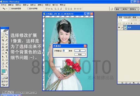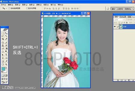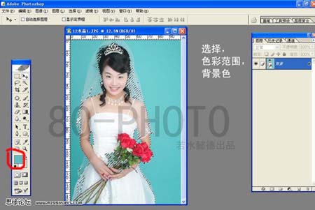 本教程比較適合背景比較純的圖片。思路:直接用魔術棒工具把背景選取出來,然后刪除再加上其他的背景就可以了。方法比較簡單適合除學者使用。
