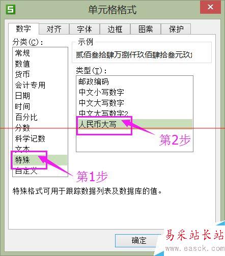 6、在“單元格格式”窗口,選擇“特殊”中的“人民幣大寫”后,單擊“確定”按鈕即可。