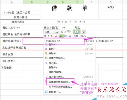 5、要大寫的金額與小寫金額一至后,但并沒(méi)有達(dá)到我們要求,我們需要的是數(shù)字大寫,怎么辦呢?選擇要大寫的數(shù)字所在單元格,右擊鼠標(biāo)鍵后,彈出鼠標(biāo)右鍵菜單欄,單擊“設(shè)置單元格格式”,如下圖所示:
