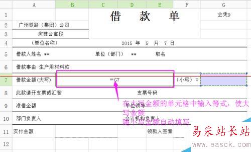 3、要使填寫大寫金額的單元格隨小寫金額所在單元格(G7)的數(shù)字變動(dòng)而自動(dòng)填寫,則需要大寫金額的單元格中輸入公式式“=G7”,目的是讓大寫數(shù)字隨小寫數(shù)字自動(dòng)填寫。