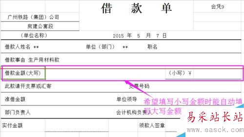 2、在填寫小寫數(shù)字時(shí),希望能夠自動(dòng)填寫大寫數(shù)字金額,如下圖所示:
