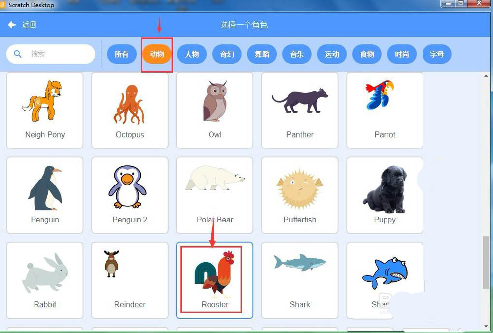 4、進(jìn)入scratch3.0的選擇一個角色頁面,在動物類別中點(diǎn)擊選中大公雞