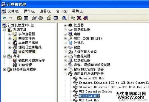 如果更換USB接口還有更換鼠標仍然不能解決問題的話,有可能是USB端口供電不足所致。我們右擊我的電腦,然后選擇管理,找到設備管理器,然后展開“通用串行總線控制器”選項,找到USB Root Hub選項。