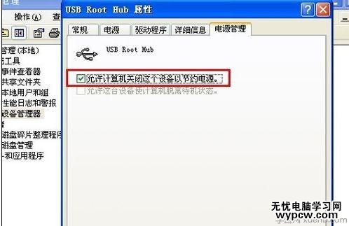我們右擊它然后選項屬性選項,找到電源管理選項,默認的是勾選“允許計算機關閉這個設備以節約電源”這個選項,我們把它去掉,然后對于每一個USB Root Hub都進行相同的設置即可(因為你不知道那個選項對應那個接口)。