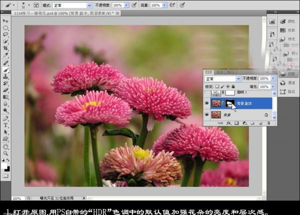 01.打開原圖,使用PS自帶的HDR色調中的默認值加強花朵的亮度和層次感