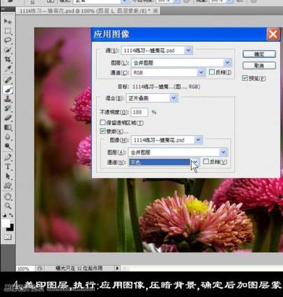 04.蓋印圖層,執行應用圖像壓暗背景,確定后加圖層蒙版把花朵擦出來