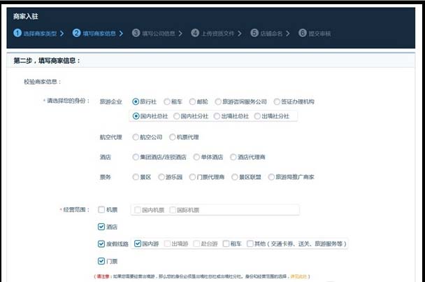 2、頁(yè)面左邊選擇商家身份,右邊選擇經(jīng)營(yíng)范圍,店鋪性質(zhì),商家所在地。頁(yè)面會(huì)此類商家需要的資質(zhì)