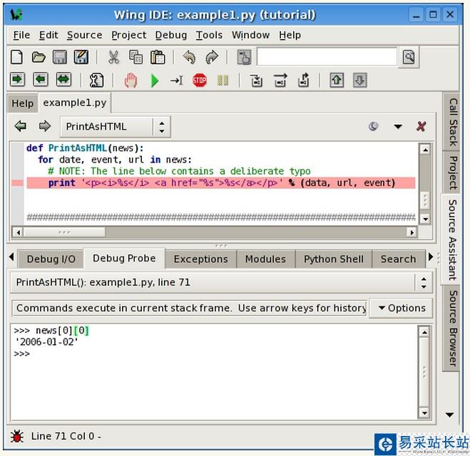 注意,Wing IDE在用戶輸入的時候提供自動完成,并在Source Assistant顯示調(diào)用簽名和文檔信息。
