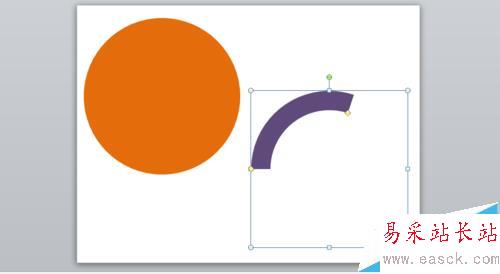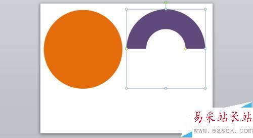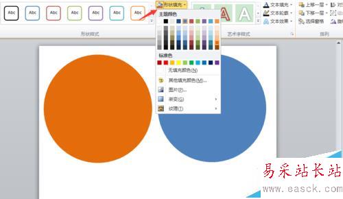 4、分別選中兩個圓,任意選擇兩種顏色。我以橙色和紫色為例。”格式——形狀填充——任選顏色“