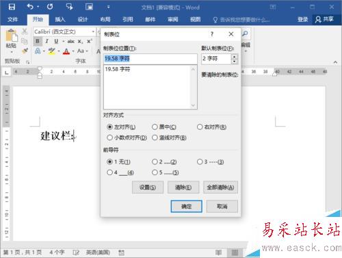 4、雙擊標(biāo)尺位置后,這個(gè)時(shí)候會(huì)彈出“制表位”對(duì)話框。如圖所示;