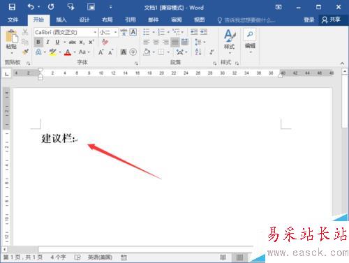 2、在新建的空白Word文檔編輯窗口,輸入“建議欄”三個(gè)文字內(nèi)容。如圖所示;