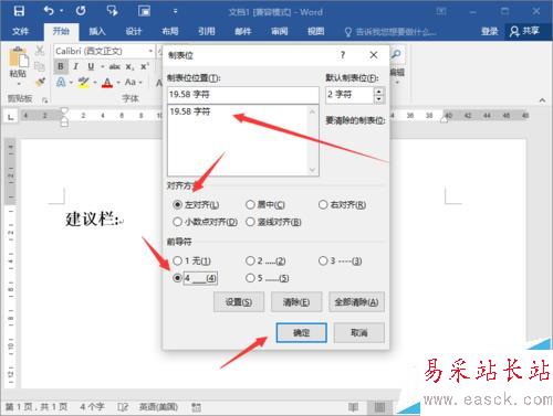 5、在彈出的制表位對(duì)話框中,選擇制表位的位置,對(duì)齊方式選擇“左對(duì)齊”、前導(dǎo)符選擇為“4”樣式,然后再點(diǎn)擊“確定”按鈕。如圖所示;