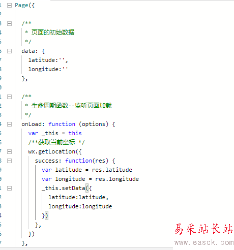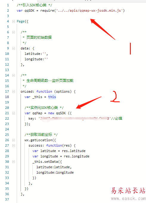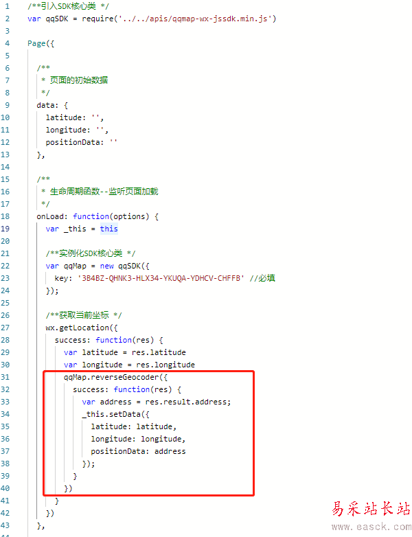 /**引入SDK核心類 */var qqSDK = require('../../apis/qqmap-wx-jssdk.min.js')Page({ /**  * 頁面的初始數(shù)據(jù)  */ data: {  latitude: '',  longitude: '',  positionData: '' }, /**  * 生命周期函數(shù)--監(jiān)聽頁面加載  */ onLoad: function(options) {  var _this = this  /**實例化SDK核心類 */  var qqMap = new qqSDK({   key: '3B4BZ-QHNK3-HLX34-YKUQA-YDHCV-CHFFB' //必填  });  /**獲取當前坐標 */  wx.getLocation({   success: function(res) {    var latitude = res.latitude    var longitude = res.longitude    qqMap.reverseGeocoder({     success: function(res) {      var address = res.result.address;      _this.setData({       latitude: latitude,       longitude: longitude,       positionData: address      });     }    })   }  }) }})