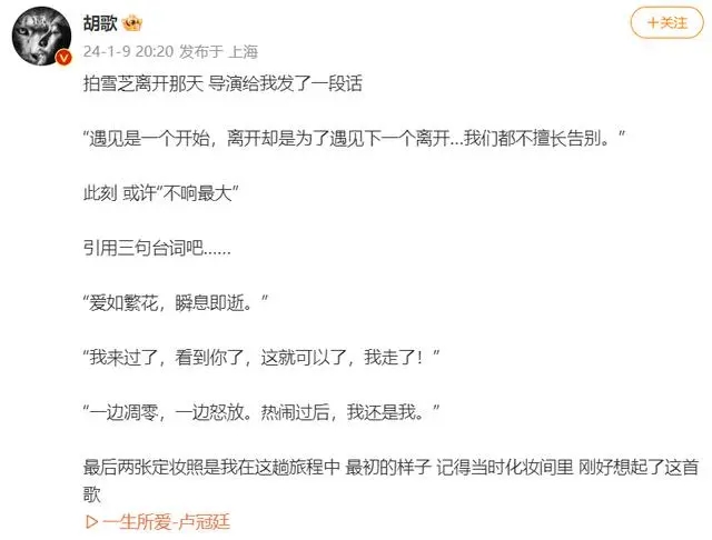 胡歌發(fā)文告別阿寶:愛如繁花,瞬息即逝