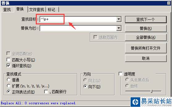 選擇替換,把查找模式設置為正則表達式,在查找框中輸入 ^/s+ ,替換框留空,點“全部替換”,即可(先全選)。