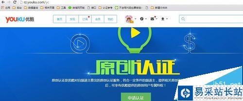 1、在優(yōu)酷首頁--上傳下拉菜單下點擊原創(chuàng)認證按鈕,或直接輸入第二個圖中的地址,進入原創(chuàng)認證首頁