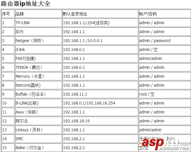 十五大常用品牌路由器地址和帳戶密碼圖表 ... [更多詳細]