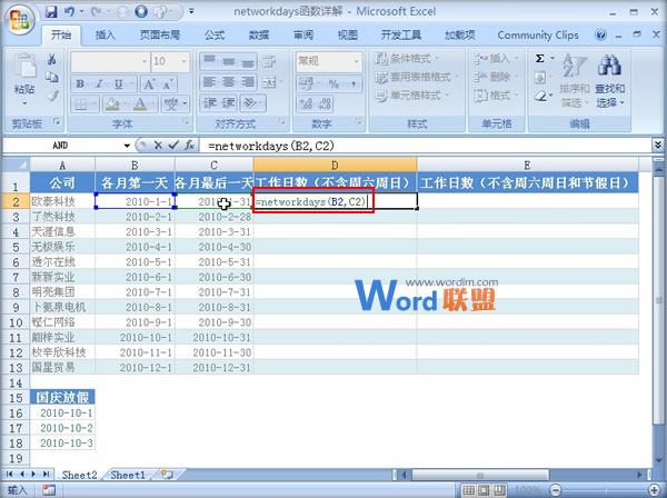 Excel 2007表格中計算指定區間內的工作天數 ... [更多詳細]