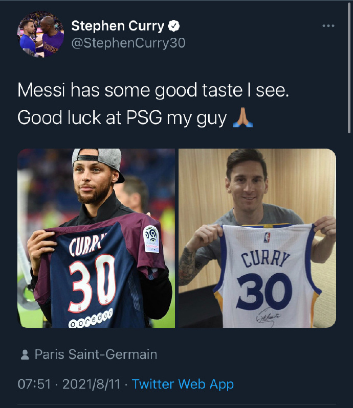 30號夢幻聯動!庫里發文祝福梅西:品味不錯,祝你在巴黎好運! ... [更多詳細]