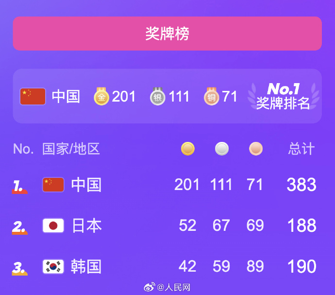 杭州亞運(yùn)會(huì):中國代表團(tuán)共獲得201金111銀71銅 ... [更多詳細(xì)]