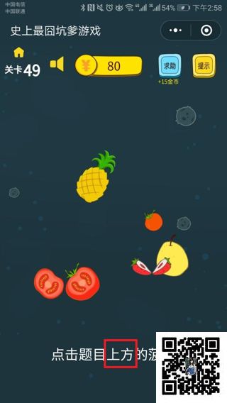微信史上最坑爹游戲第49關【點擊題目上方的菠蘿】答案攻略 ... [更多詳細]