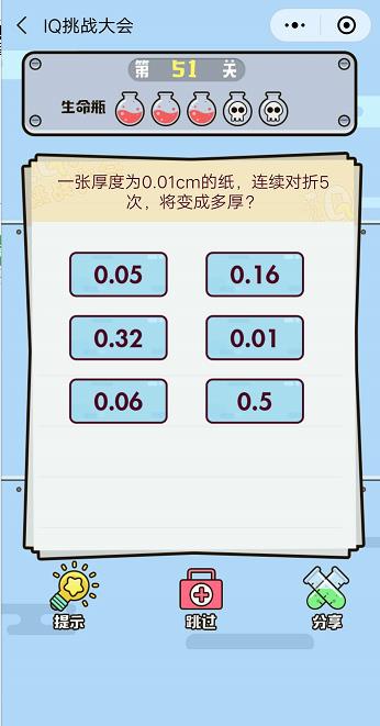 微信IQ挑戰大會第51關【一張厚度為0.01cm的紙連續對折5次將變成多厚】答案攻略 ... [更多詳細]
