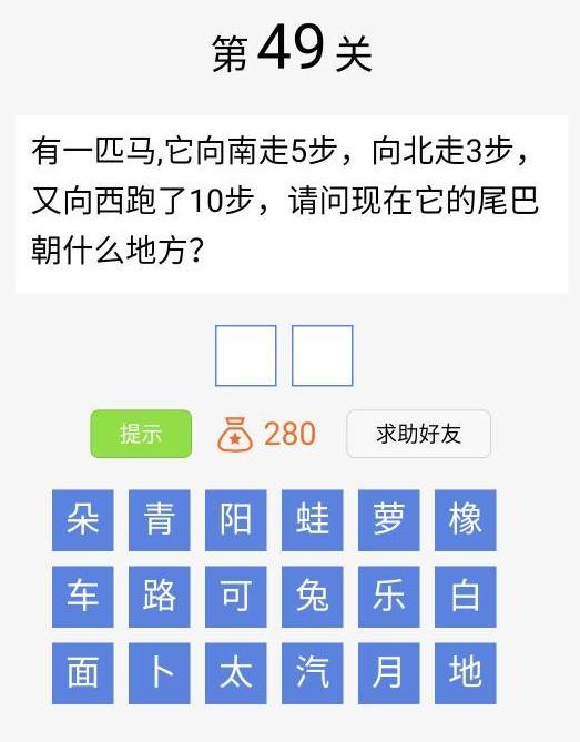 微信腦筋急轉(zhuǎn)彎大闖關(guān)第49關(guān)【有一匹馬它向南走5步向北走3步又向西跑了10步請(qǐng)問現(xiàn)在它的尾巴朝什么地方】答案攻略 ... [更多詳細(xì)]