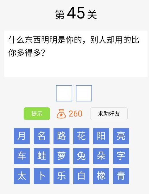 微信腦筋急轉(zhuǎn)彎大闖關(guān)第45關(guān)【什么東西明明是你的別人卻用的比你多得多】答案攻略 ... [更多詳細(xì)]