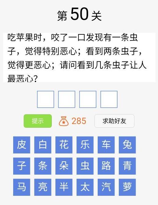 微信腦筋急轉(zhuǎn)彎大闖關(guān)第50關(guān)【吃蘋果時(shí)咬了一口發(fā)現(xiàn)有一條蟲子覺得特別惡心看到兩條蟲子覺得更惡心請(qǐng)問看到幾條蟲子讓人最惡心】答案攻略 ... [更多詳細(xì)]