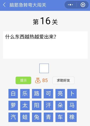 微信腦筋急轉(zhuǎn)彎大闖關(guān)第16關(guān)【什么東西越熱越愛出來(lái)】答案攻略 ... [更多詳細(xì)]