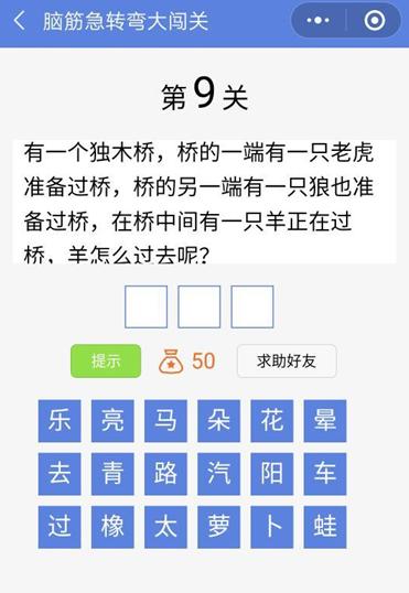 微信腦筋急轉(zhuǎn)彎大闖關(guān)第9關(guān)【有一個(gè)獨(dú)木橋羊怎么過(guò)去呢】答案攻略 ... [更多詳細(xì)]