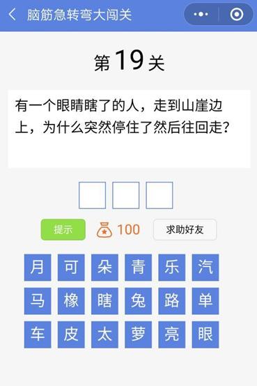 微信腦筋急轉(zhuǎn)彎大闖關(guān)第19關(guān)【有一個(gè)眼睛瞎了的人走到山崖邊上為什么突然停住了然后往后走】答案攻略 ... [更多詳細(xì)]