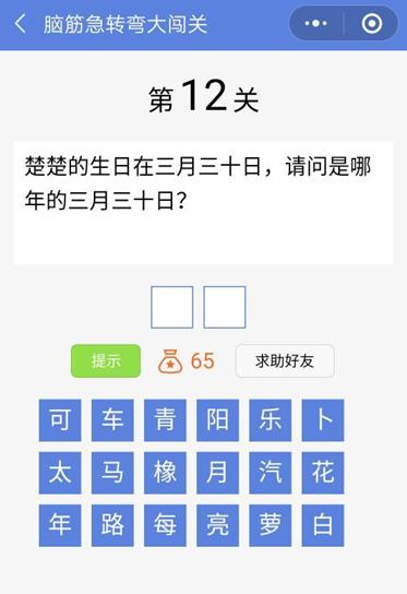 微信腦筋急轉(zhuǎn)彎大闖關(guān)第12關(guān)【楚楚的生日在三月三十日請(qǐng)問(wèn)是哪年的三月三十日】答案攻略 ... [更多詳細(xì)]