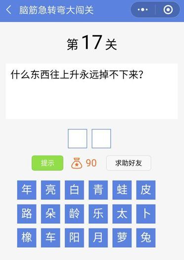 微信腦筋急轉(zhuǎn)彎大闖關(guān)第17關(guān)【什么東西往上升永遠(yuǎn)掉不下來(lái)】答案攻略 ... [更多詳細(xì)]