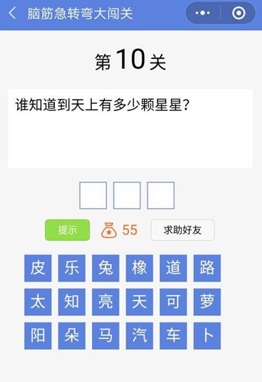 微信腦筋急轉(zhuǎn)彎大闖關(guān)第10關(guān)【誰(shuí)知道天上有多少顆星星】答案攻略 ... [更多詳細(xì)]