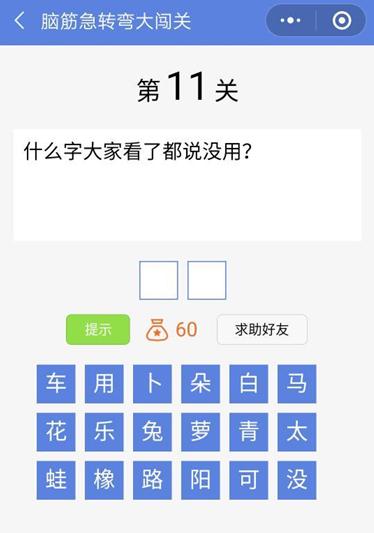 微信腦筋急轉(zhuǎn)彎大闖關(guān)第11關(guān)【什么字大家看了都說(shuō)沒用】答案攻略 ... [更多詳細(xì)]