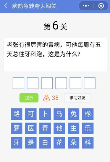 微信腦筋急轉(zhuǎn)彎大闖關(guān)第6關(guān)【老張有很厲害的胃病可他每周有五天總往牙科跑這是為什么】答案攻略 ... [更多詳細(xì)]