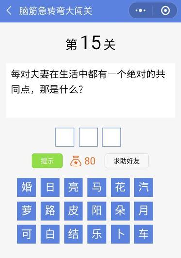 微信腦筋急轉(zhuǎn)彎大闖關(guān)第15關(guān)【每對(duì)夫妻在生活中都有一個(gè)絕對(duì)的共同點(diǎn)那是什么】答案攻略 ... [更多詳細(xì)]