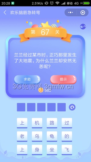 微信歡樂腦筋急轉(zhuǎn)彎第67關(guān)【蘭蘭經(jīng)過某市時正巧那里發(fā)生了大地震為什么蘭蘭卻安然無恙呢】答案 ... [更多詳細]