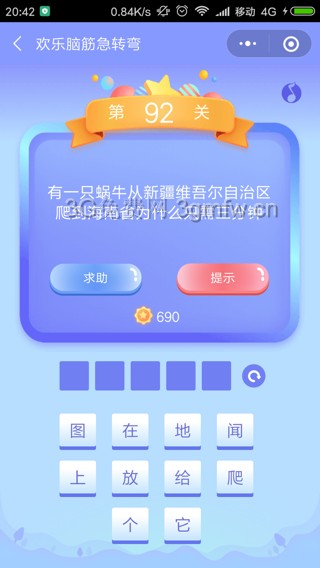 微信歡樂腦筋急轉(zhuǎn)彎第92關(guān)【有一只蝸牛從新疆維吾爾自治區(qū)爬到海南省為什么只需三分鐘】答案 ... [更多詳細]