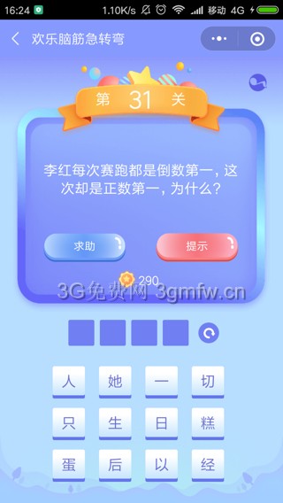 微信歡樂腦筋急轉彎第31關【李紅每次賽跑都是倒數第一這次卻是正數第一為什么】答案 ... [更多詳細]