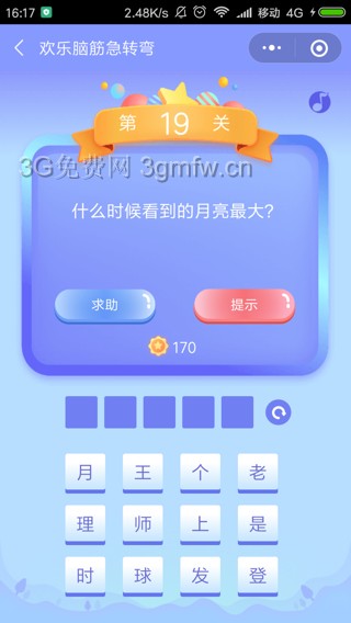 微信歡樂腦筋急轉彎第19關【什么時候看到的月亮最大】答案 ... [更多詳細]
