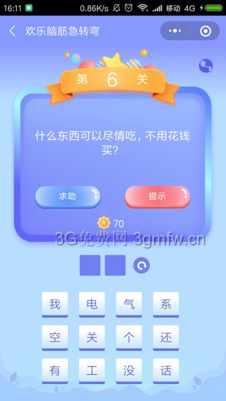 微信歡樂腦筋急轉彎第6關【什么東西可以盡情吃不用花錢買】答案攻略 ... [更多詳細]