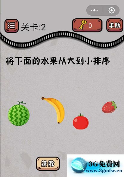 微信最燒腦游戲絕地吃雞求生大作戰第23關【將下面的水果從大到小排序】答案攻略 ... [更多詳細]