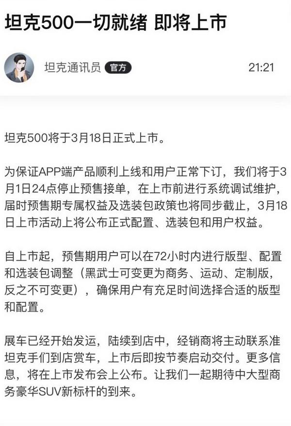 坦克500將于3月18日上市 搭載3.0T+9AT動力總成 ... [更多詳細]