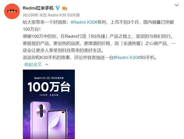 Redmi K30系列國內銷量突破100萬臺 上市不到3個月 ... [更多詳細]