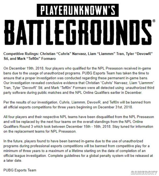 《絕地求生》北美四名職業(yè)選手作弊 被禁賽三年 ... [更多詳細(xì)]