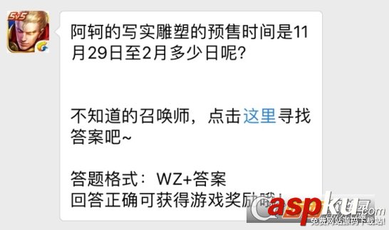 王者榮耀每日一題11月30日答案 王者榮耀阿軻的寫實雕像的預(yù)售時間是什么? ... [更多詳細(xì)]